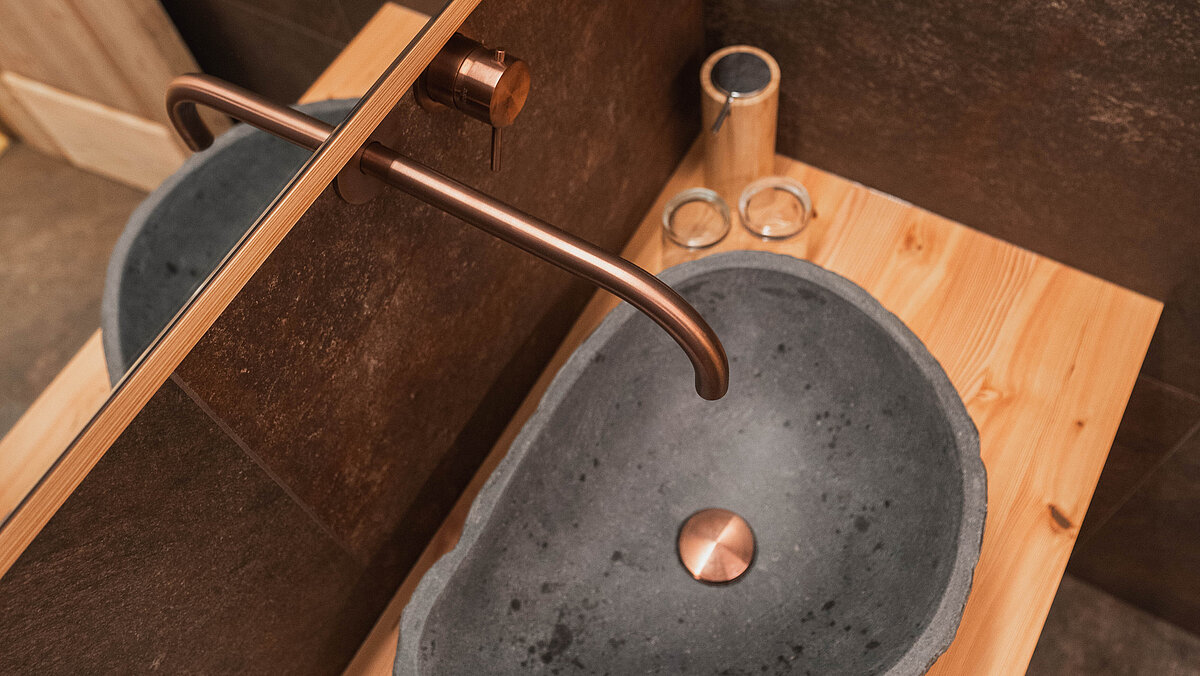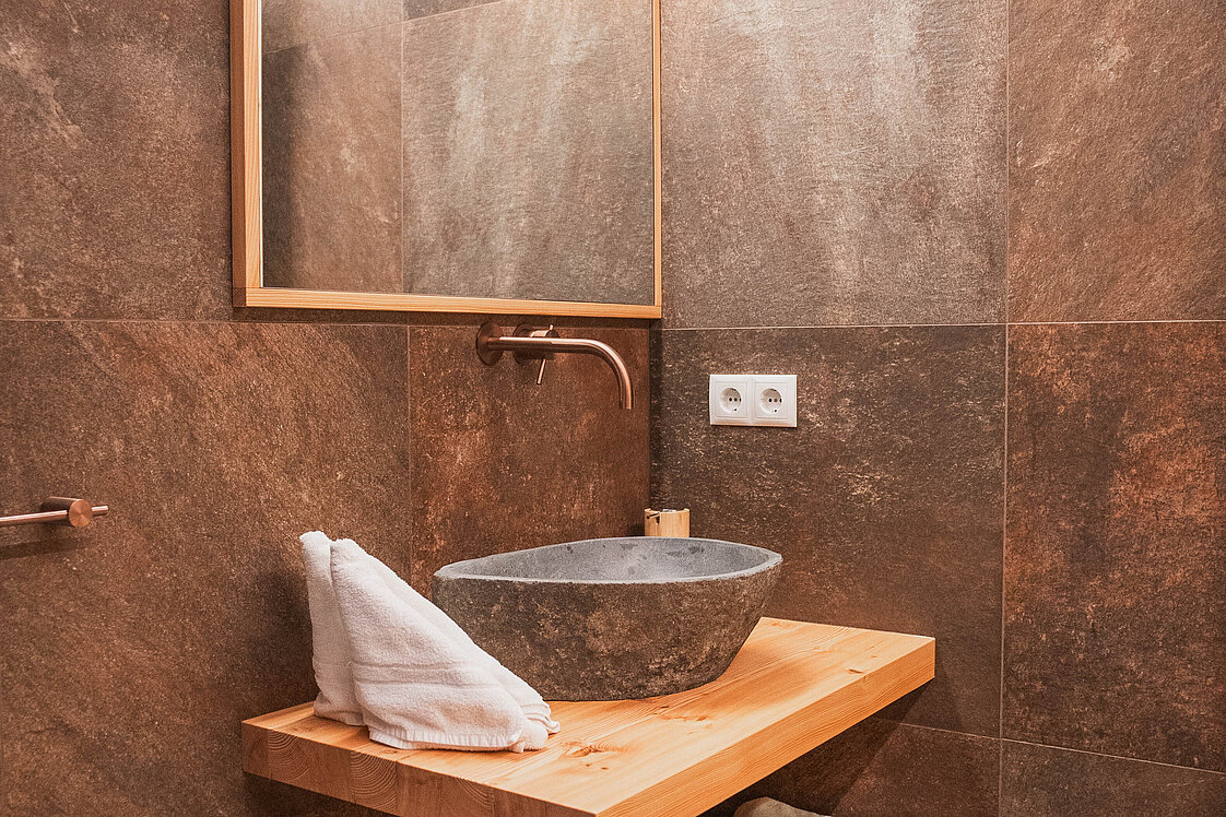 Durch den Einsatz hochwertiger Materialien und einer sorgfältigen Planung entstand eine Wohlfühlatmosphäre, die den Charme traditioneller Bauernhäuser mit zeitgemäßem Komfort vereint. So können die Gäste des Falkenau den ländlichen Charme in stilvollen, modernen Bädern genießen.