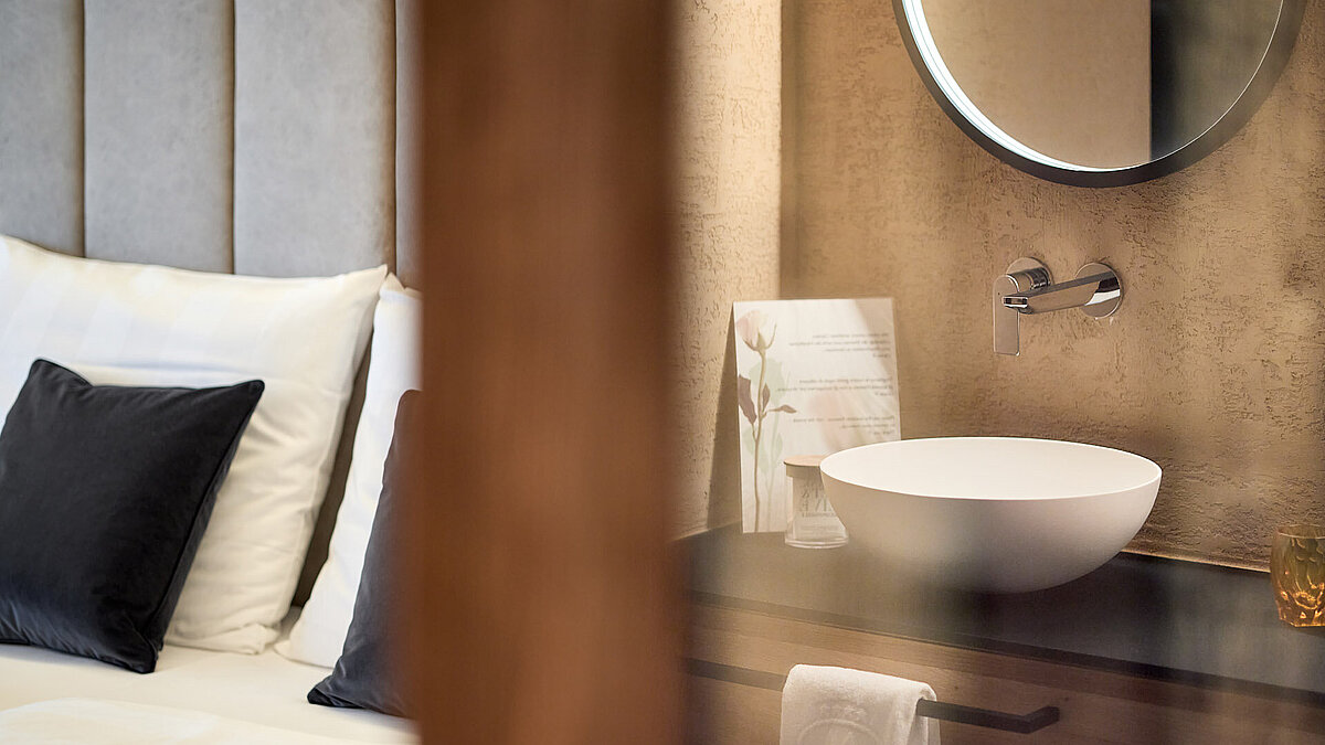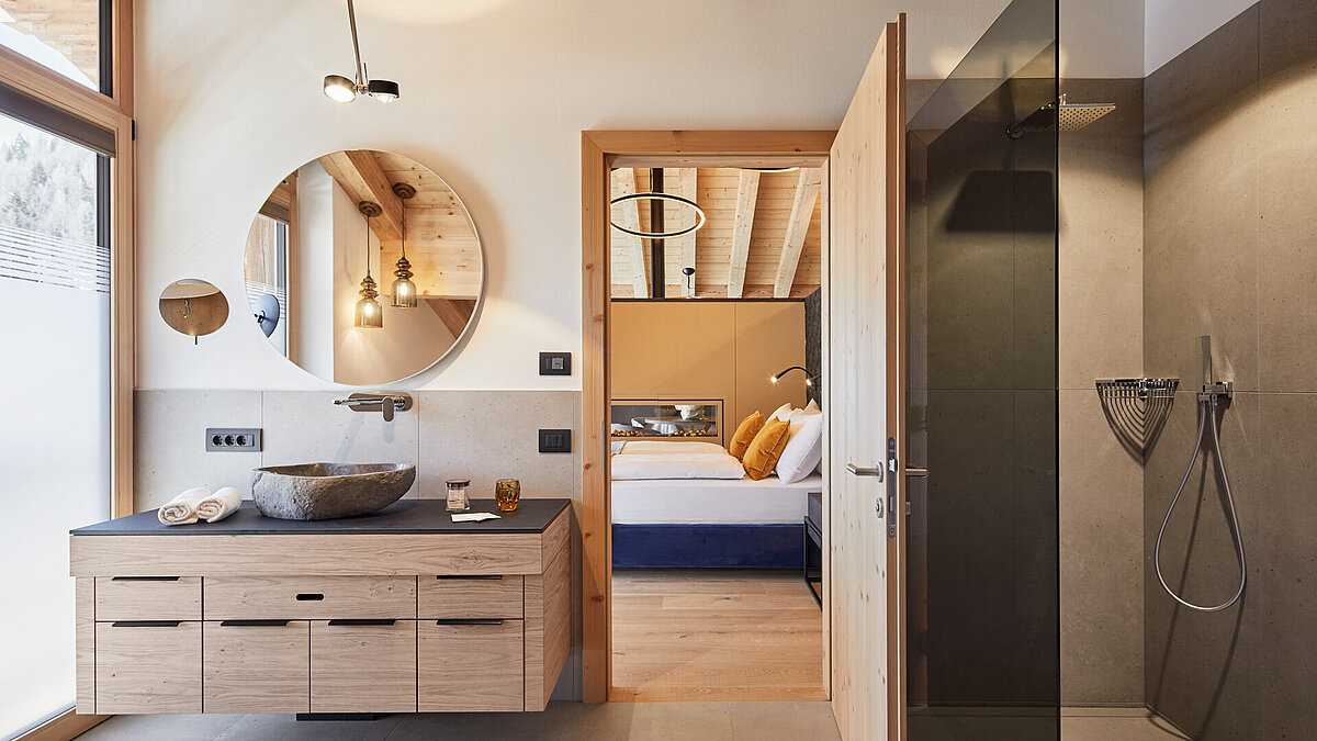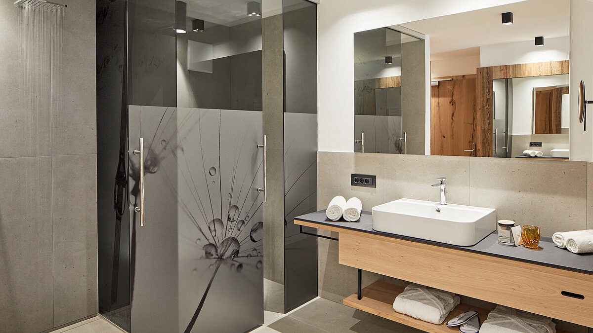 Nelle nuove camere e nei bagni, l'atmosfera di montagna si fonde armoniosamente con il design moderno per creare un ambiente confortevole e caratteristico. Moderni e dal design elegante, combinano materiali di alta qualità con elementi naturali che riflettono l'ambiente alpino. Docce spaziose, piastrelle pregiate, design artistico delle pareti e luci soffuse creano un'atmosfera lussuosa e rilassante. Particolare enfasi è stata posta su una combinazione di colori armoniosa che cattura la tranquillità e la serenità delle montagne circostanti. I nuovi bagni non solo offrono il massimo comfort, ma invitano anche gli ospiti a rilassarsi dopo una giornata attiva in montagna.