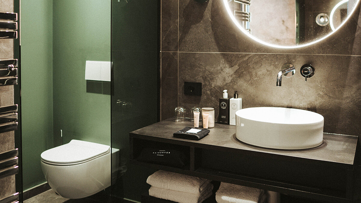 I nuovi bagni convincono per il loro elegante purismo: rivestimenti delle pareti in grande formato e di tonalità scura, rubinetteria integrata nelle pareti e un concetto di illuminazione finemente coordinato creano un'atmosfera rilassata ed esclusiva. Specchi rotondi con retroilluminazione, docce a filo pavimento e lavabi d'appoggio danno un chiaro statement di design.