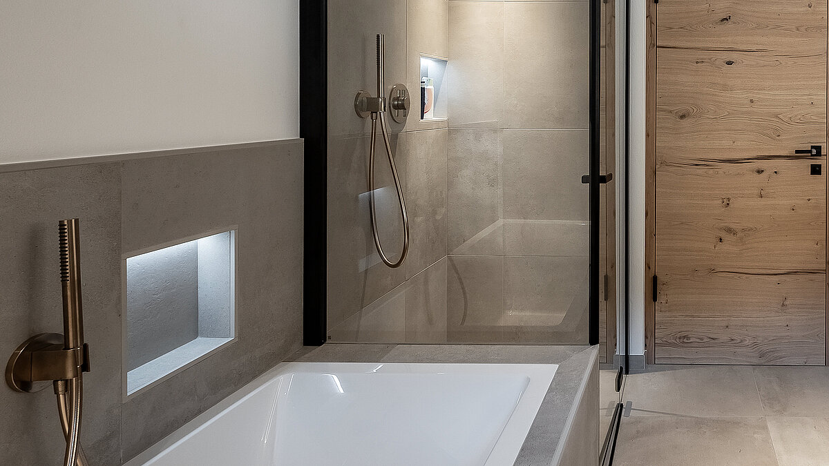 La progettazione e la scelta dei prodotti sono state effettuate in stretta collaborazione con gli esperti di showroom e tecnologia di INNERHOFER. In questo modo è stato possibile realizzare in modo ottimale i desideri individuali, dai pavimenti e le piastrelle eleganti ai sanitari di prima classe. Una moderna pompa di calore di iDM Energiesysteme garantisce un approvvigionamento energetico sostenibile ed efficiente.