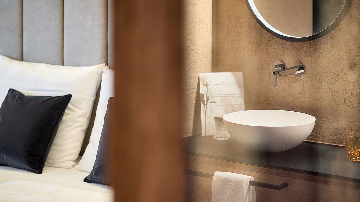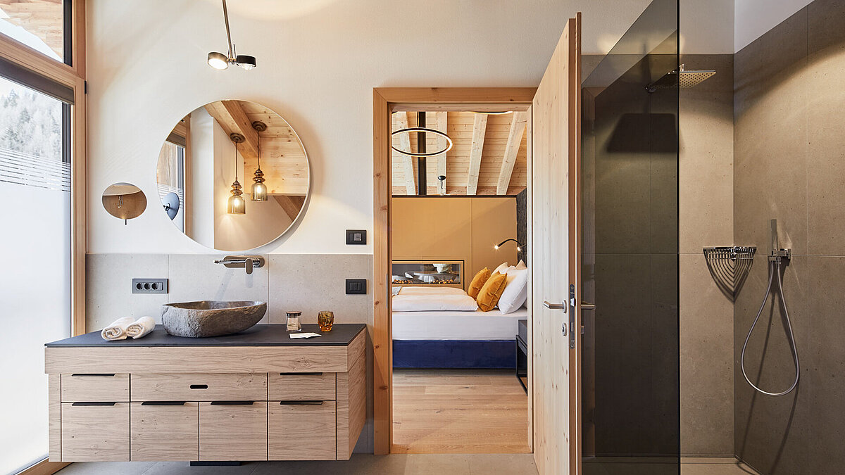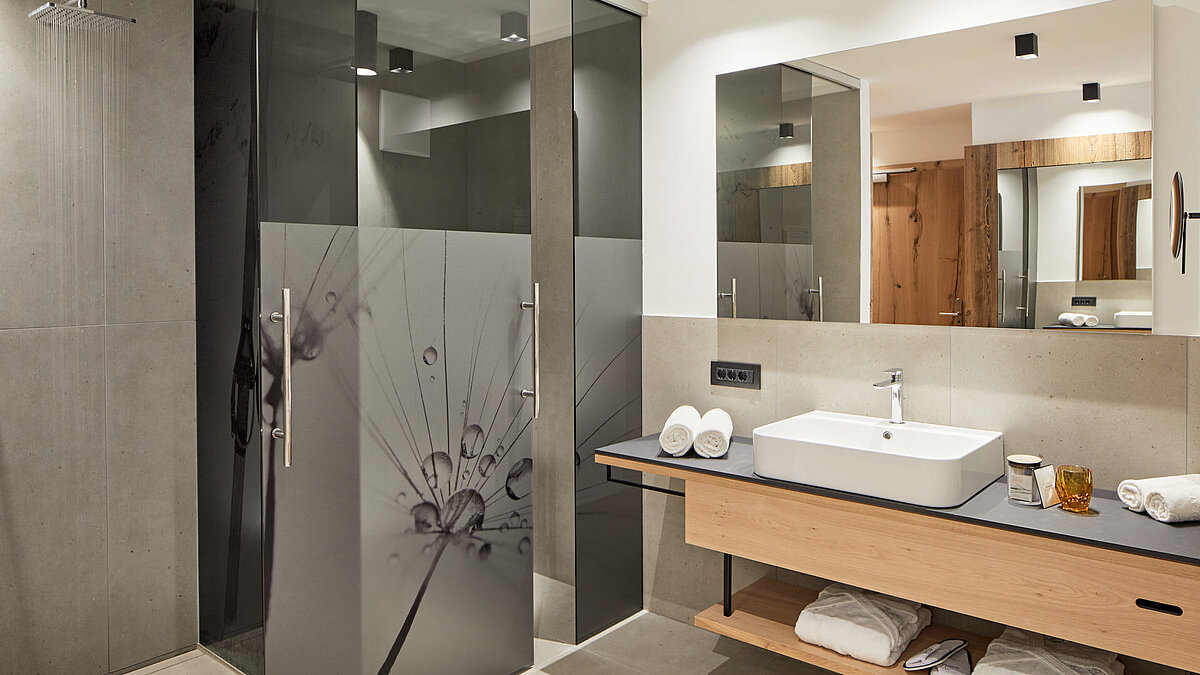 In den neuen Zimmern und Bädern verschmilzt die Gebirgsatmosphäre harmonisch mit modernem Design und sorgt für ein komfortables und charakteristisches Ambiente. Modern und stilvoll gestaltet, vereinen sie hochwertige Materialien mit natürlichen Elementen, die die alpine Umgebung widerspiegeln. Großzügige Duschen, edle Fliesen und kunstvolle Wandgestaltung, sowie sanfte Beleuchtung schaffen eine luxuriöse und gleichzeitig entspannende Atmosphäre. Besonderer Wert wurde auf eine harmonische Farbgestaltung gelegt, die die Ruhe und Gelassenheit der umliegenden Berge einfängt. Die neuen Bäder bieten nicht nur höchsten Komfort, sondern laden auch zum Entspannen nach einem aktiven Tag in den Bergen ein.