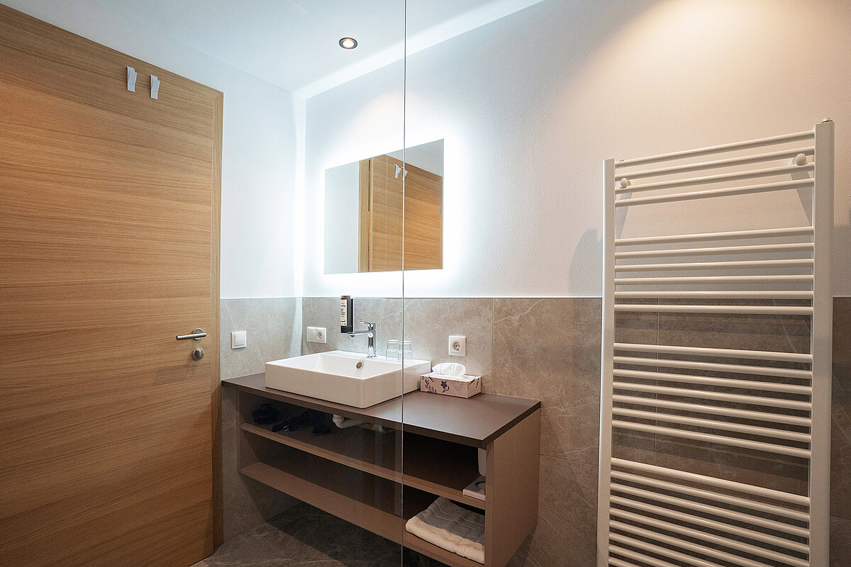 Bei der Ausstattung lag der Fokus auf langlebigen Materialien, angenehmer Haptik und einem durchdachten Design. Die Kombination aus Funktionalität und ästhetischem Anspruch macht jedes Bad zu einem Ort des Wohlbefindens – passend zum Stil und zur Gastlichkeit des Hauses.