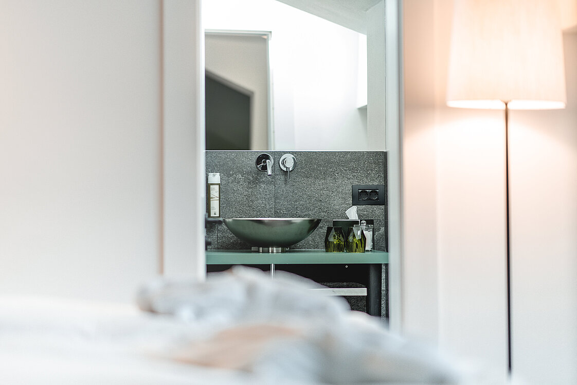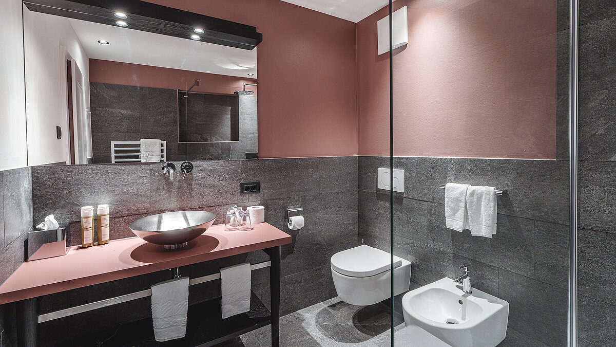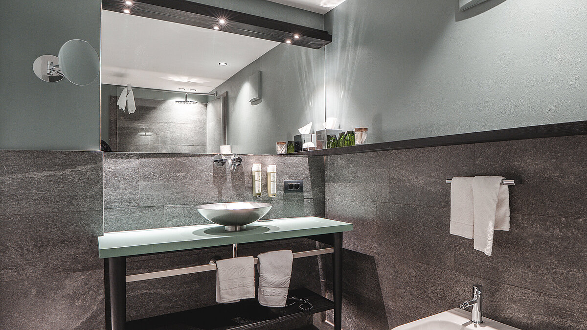 Die Badezimmer des Hotels Kreuzbergpass bieten somit ein Höchstmaß an Komfort und Design und tragen wesentlich zur wohltuenden Atmosphäre bei, die das gesamte Hotel ausstrahlt.
