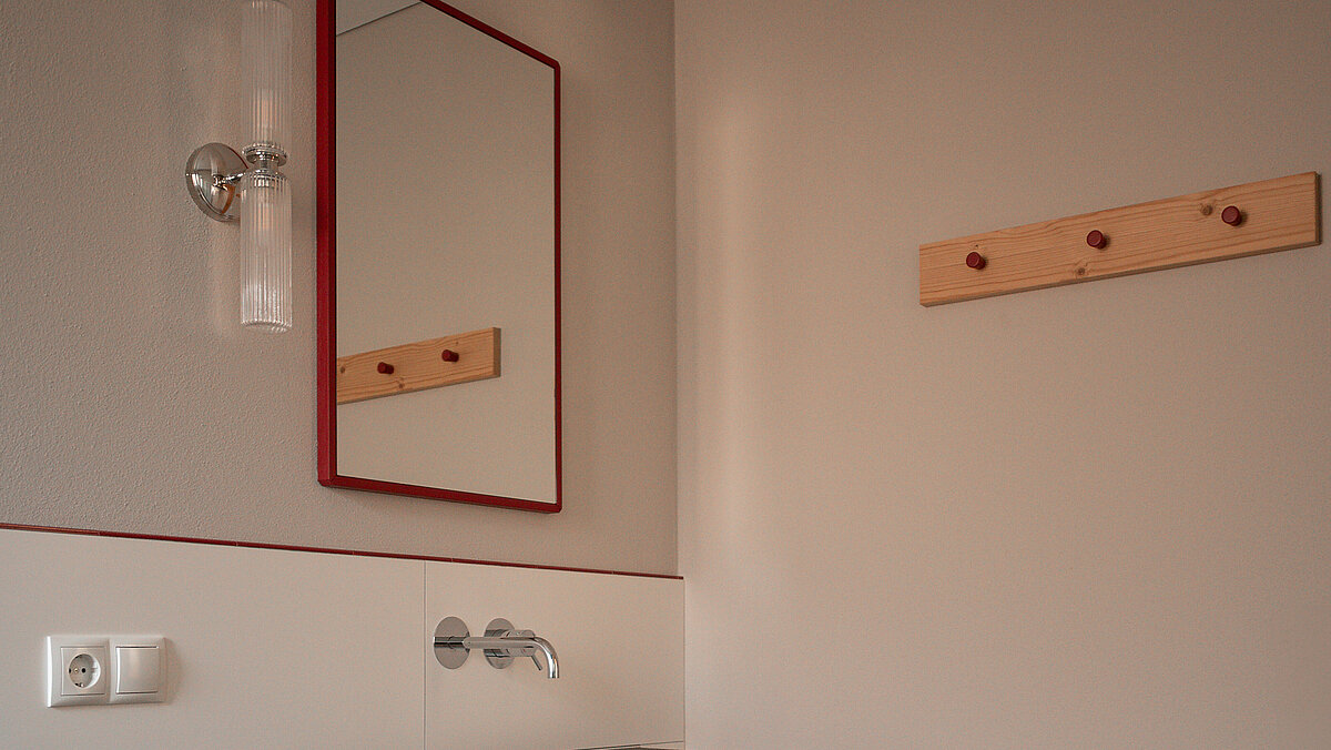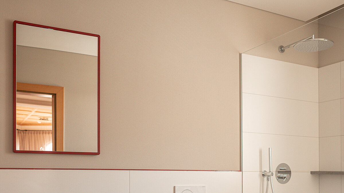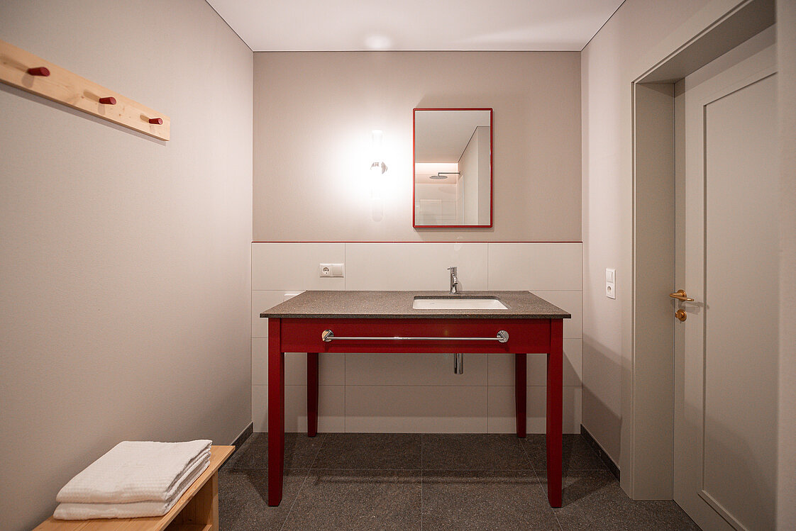Die neuen Badezimmer wurden vollständig mit Sanitärprodukten von INNERHOFER ausgestattet. Auffällig im Schulerhof ist der Einsatz roter Details – ein Gestaltungselement, das sich vom Außenbereich bis in die Zimmerbäder zieht. Die ausgewählten Produkte greifen diesen Stil auf und unterstützen ein ruhiges, aufgeräumtes Gesamtbild.