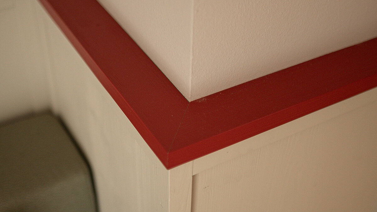 Ein roter Akzent, der sich von der Fassade bis in die Bäder fortsetzt.