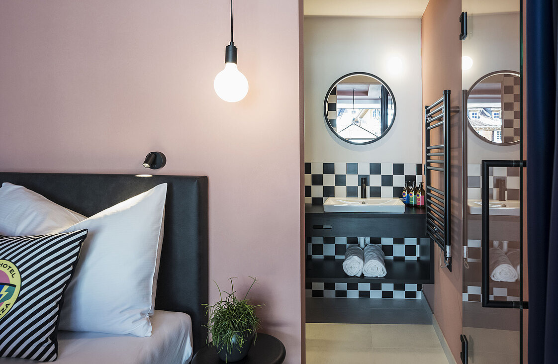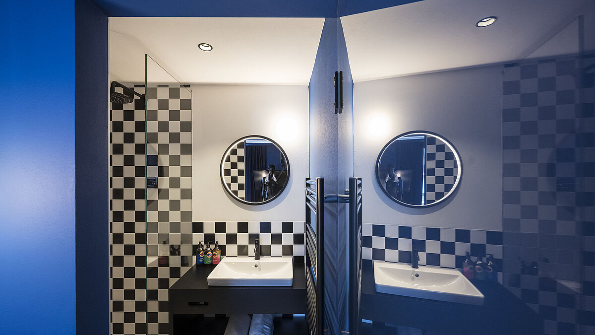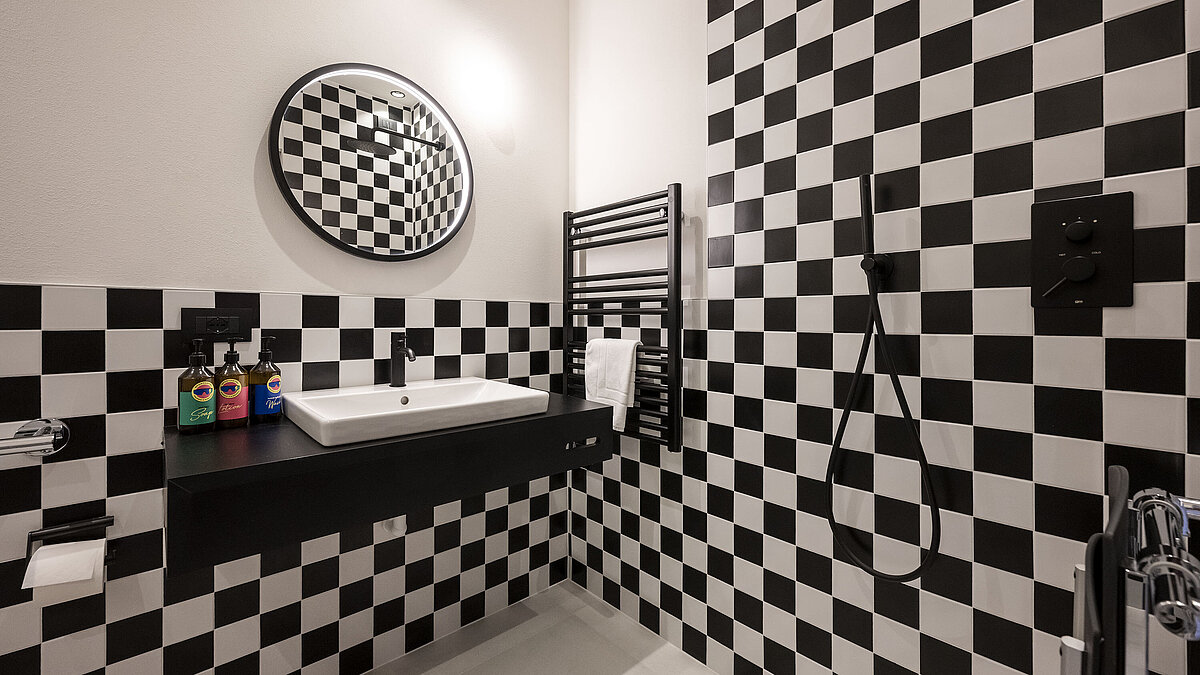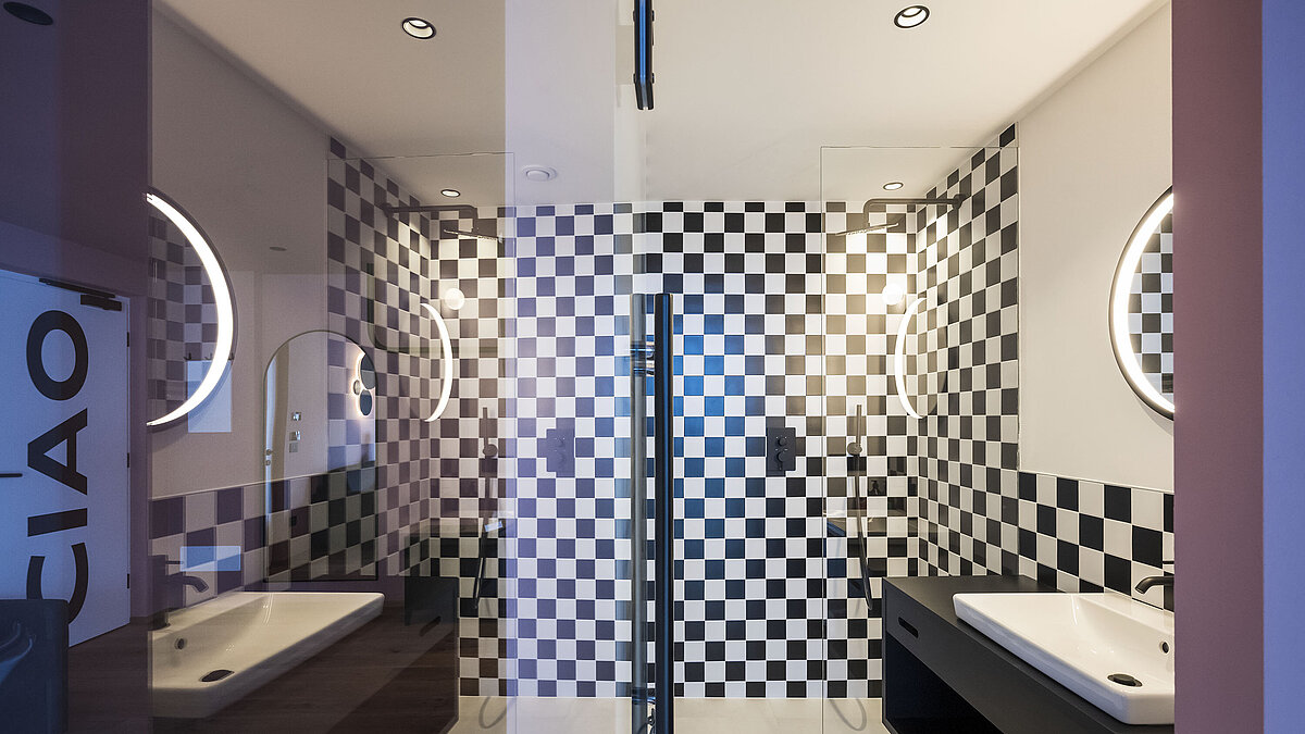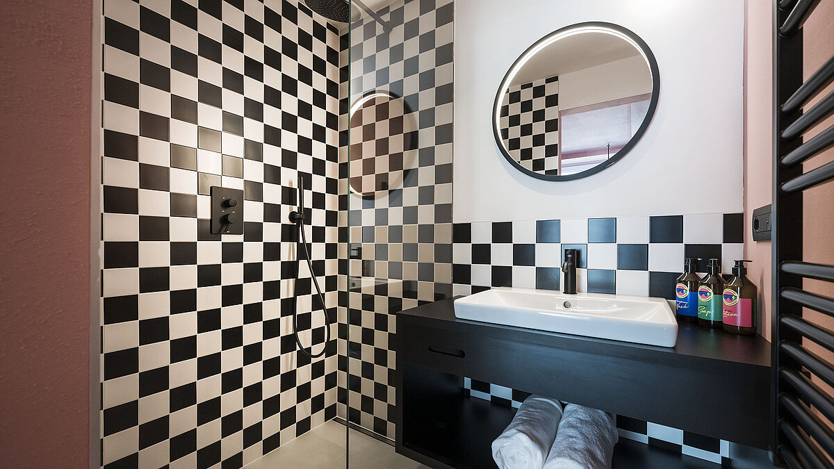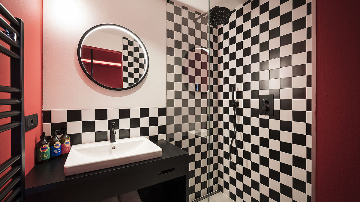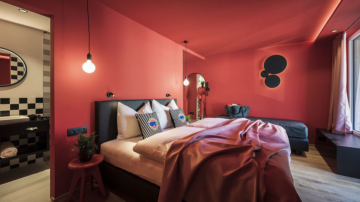 Schon die Architektur und Ausstattung zeigen, worum es geht: unkomplizierter Komfort, Funktionalität und ein klares Designkonzept, inspiriert von den ikonischen 80er Jahren. Die 18 Zimmer setzen auf kräftige Farbakzente – rot für den „Red Course“ mit Blick zum Rosengarten, blau für den „Blue Course“ in Richtung Latemar. Die Suiten „Partenza“ und „Arrivo“ runden das Rennlauf-Thema gekonnt ab.